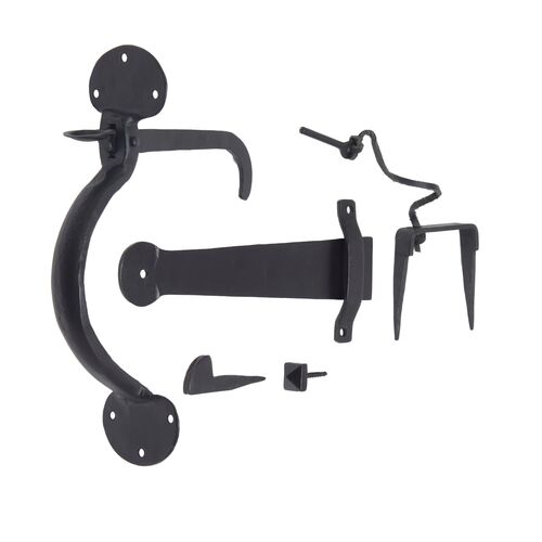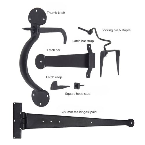 - Each pack comes with: two 18" tee hinges, Suffolk thumb latch, latch bar, latch bar strap, latch keep, square head stud, locking pin and staple, black woodscrews